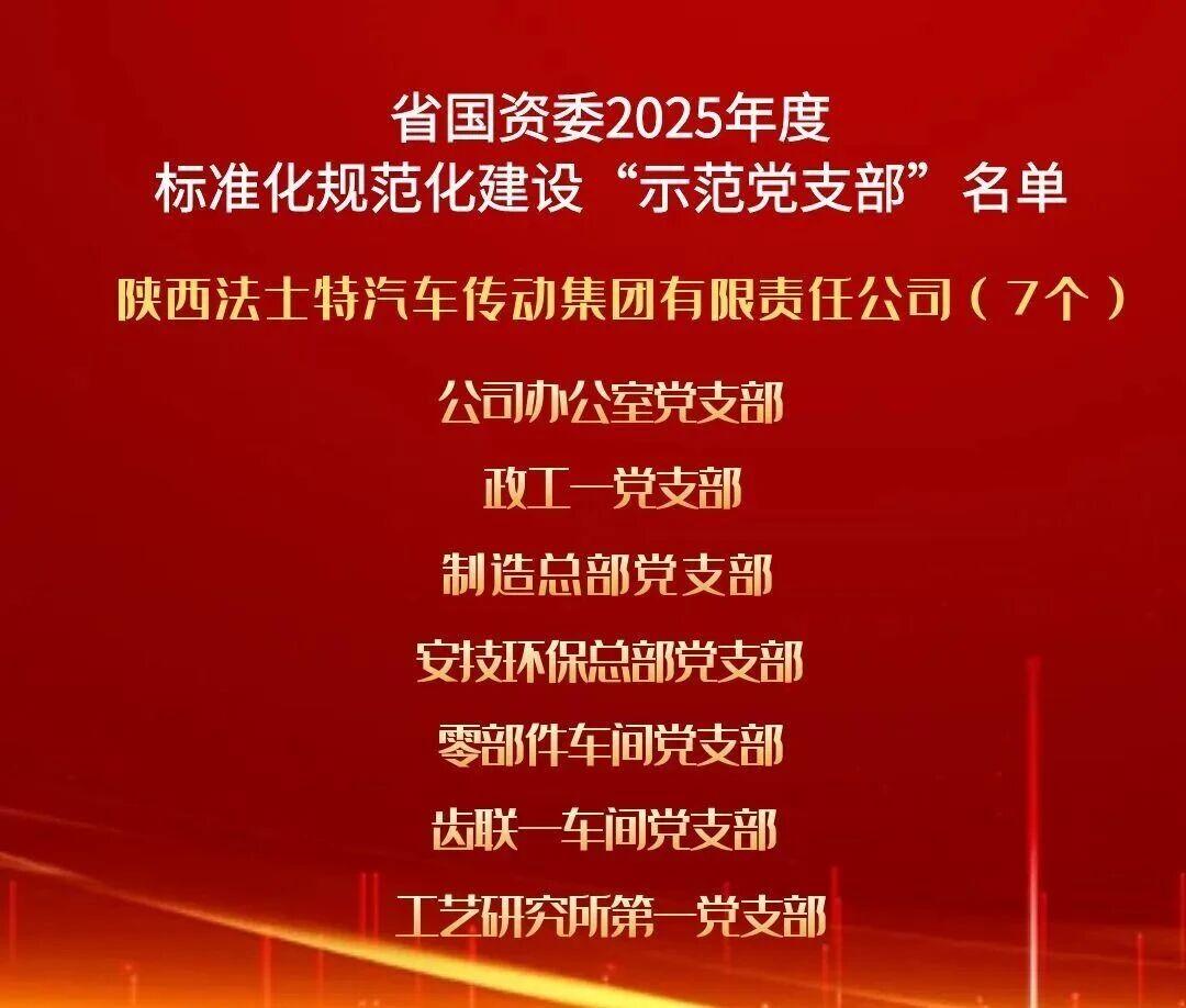 近日,陜西省國資委黨委通報2025年度標準化規范化建設示范黨支部名單,法士特集團公司辦公室、政工一、制造總部等7個基層黨支部榜上有名,榮獲省國資委“示范黨支部”稱號。這既是對法士特集團黨委深耕黨建品牌建設、推進基層黨組織標準化規范化建設成果的高度肯定,更彰顯了企業以制度落實強化組織效能、推進黨建與業務深度...